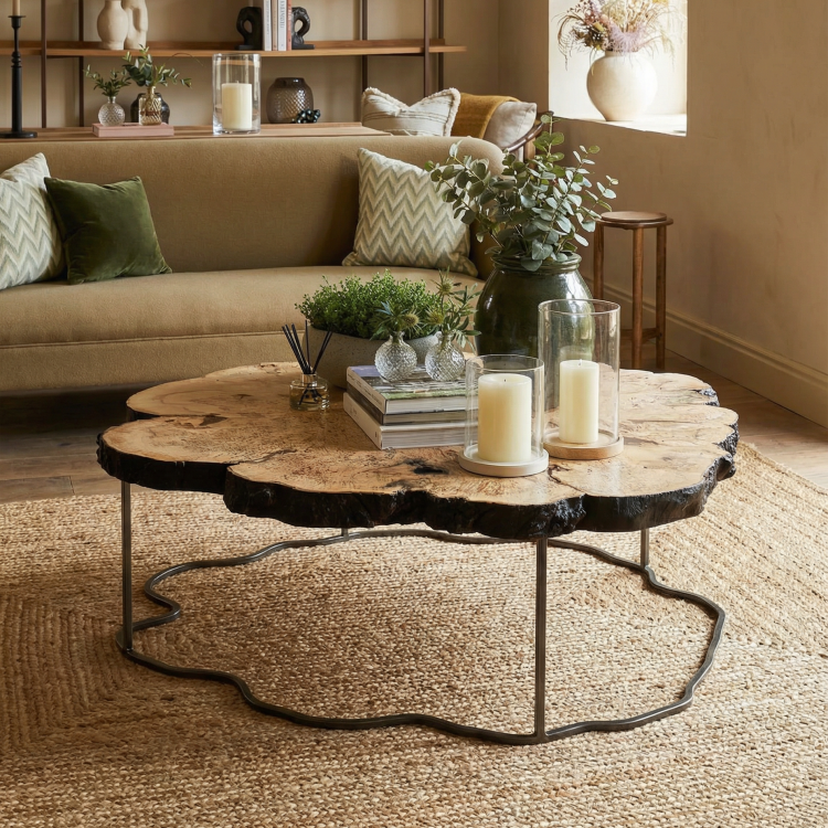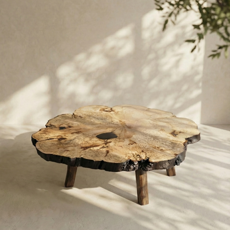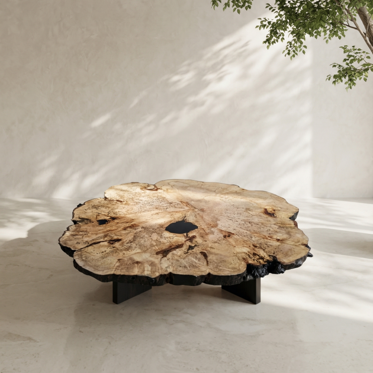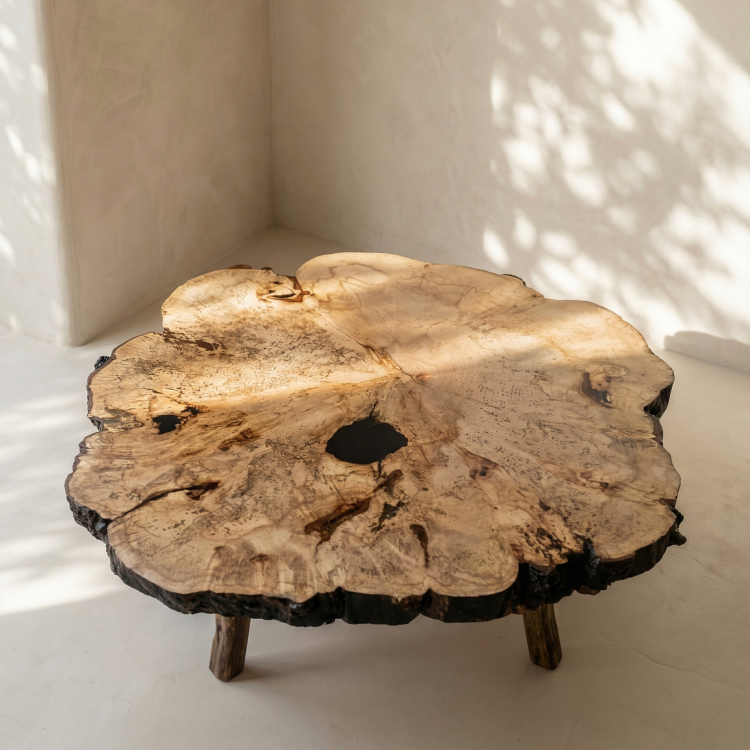 The “Pass” tree trunk slice coffee table celebrates the natural end grain details of a magnificent maple tree